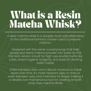 Say goodbye to mold-prone bamboo whisks. Our Resin Matcha Whisk is designed for daily use in modern cafés and kitchens. Made from high-quality resin that’s easy to clean and built to last. Unlike traditional whisks, it holds its shape, can be rinsed or washed regularly without damage, and is perfect for busy environments where hygiene matters.